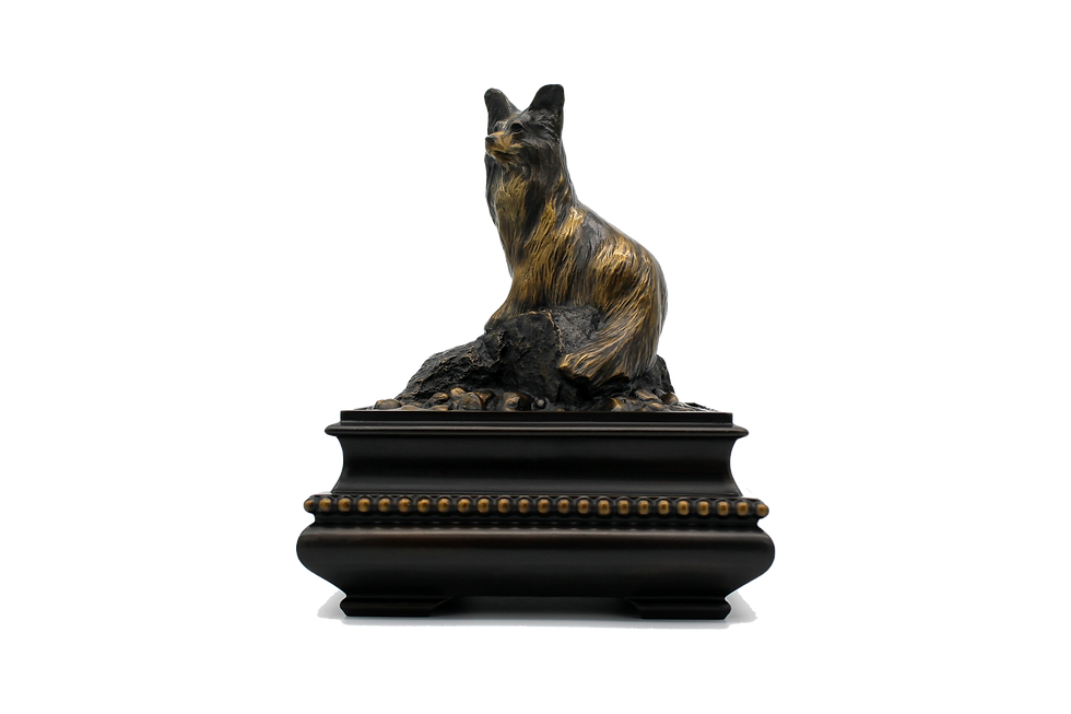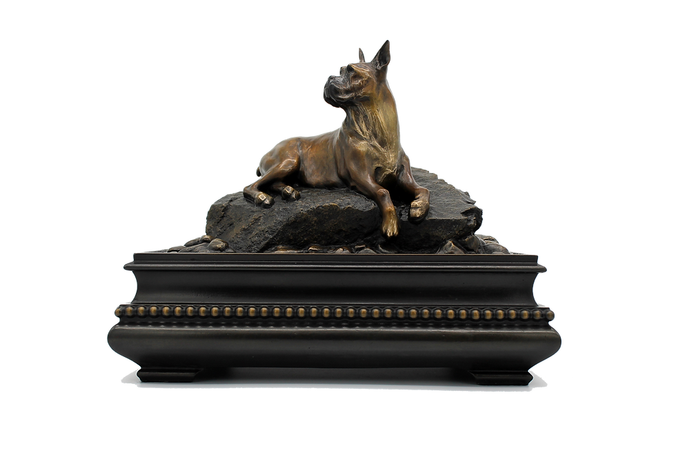 Each sculpture has a bronze plate underneath secured with four screws to securely and safely store keepsakes or remains. The bronze plate can be custom engraved with the pet’s name and any special words that one might want to add.